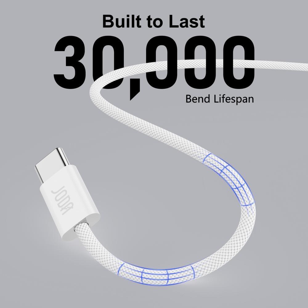 كيبل JODA المصنوع بخيوط النايلون الفاخرة يجمع بين المتانة والأناقة، بقدرة شحن تصل إلى 60 واط. تصميم مضفّر ناعم وقوي يتحمل حتى 32,000 انحناء، ما يجعله مثاليًا للاستخدام اليومي سواء في المنزل أو أثناء التنقل.