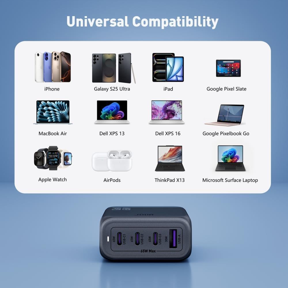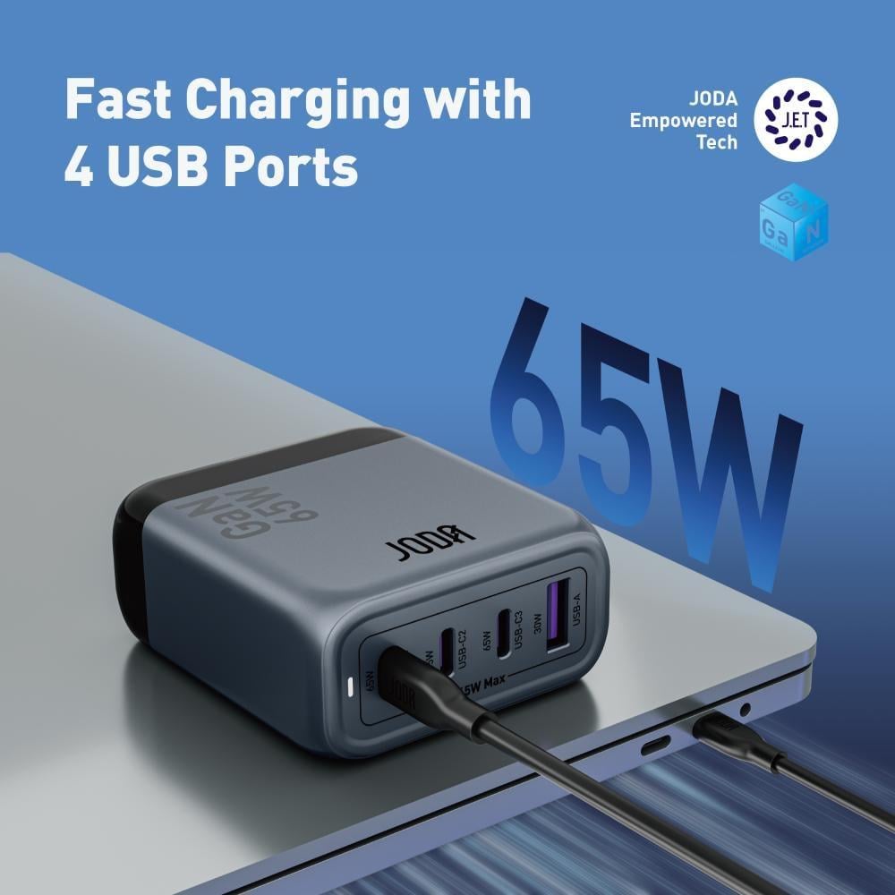 • صُممت منصة شحن 65 واط جودا مع 4 منافذ شحن مختلفة منفذ USB-C1 بقدرة إخراج 65 واط، ومنفذ USB-C2 بقوة شحن حتى 45 واط.