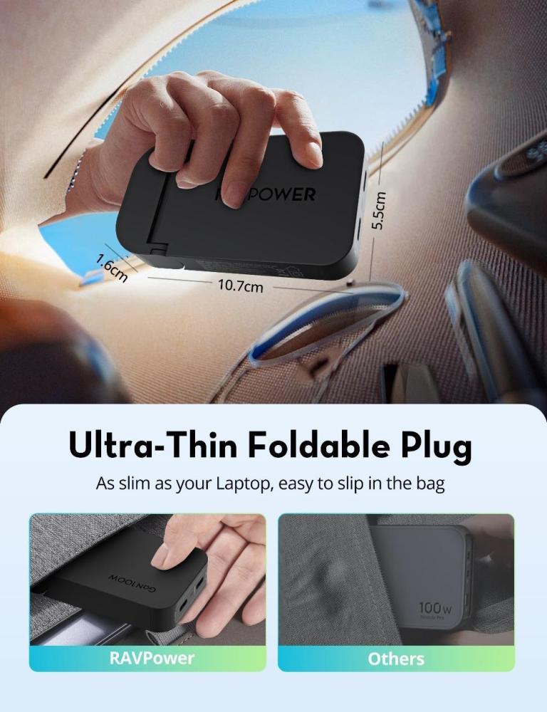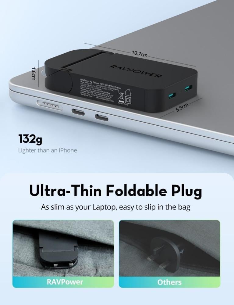 - تصميم فائق النحافة مع قابس قابل للطي لسهولة التخزين والحمل.