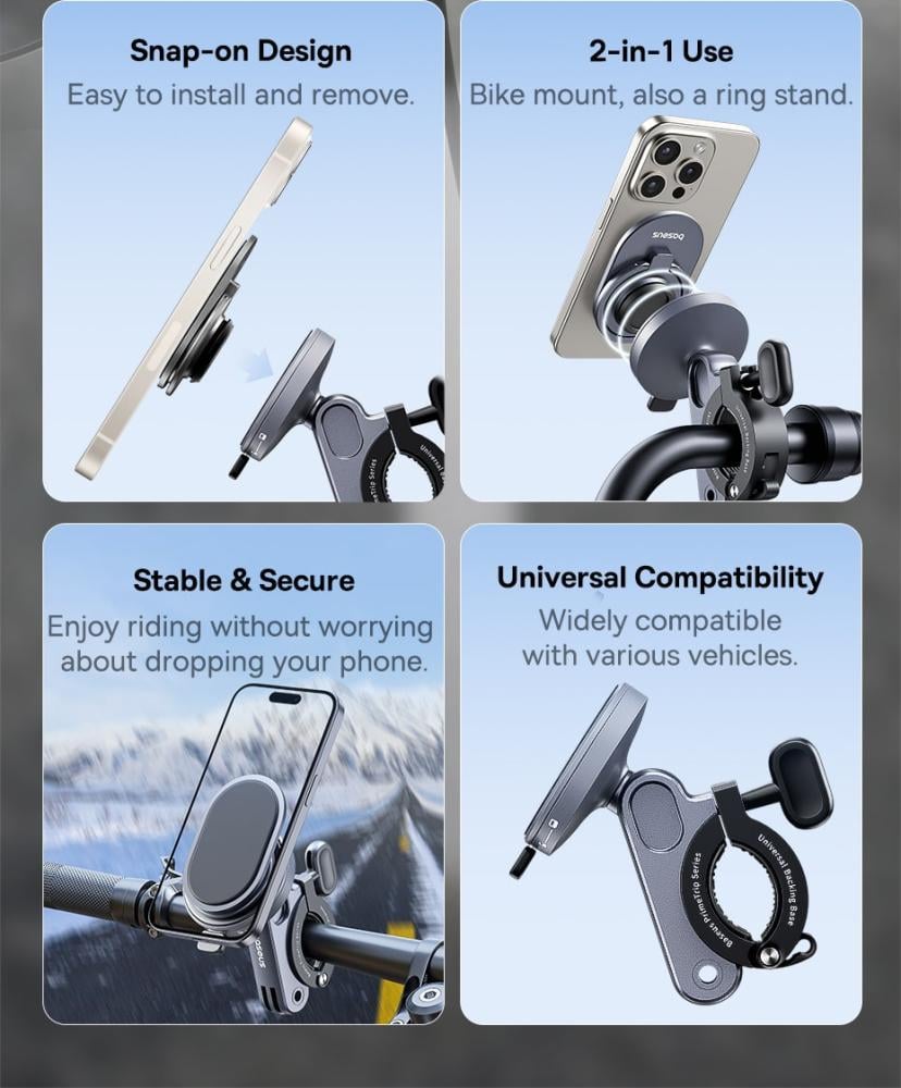 • نظام تثبيت محكم وسريع: يمكنك وضع هاتفك وتثبيته بكل سهولة بفضل التصميم الذكي الذي يساعدك في تحريك هاتفك وفكه خلال ثواني أثناء ممارسة رياضة الدراجات.