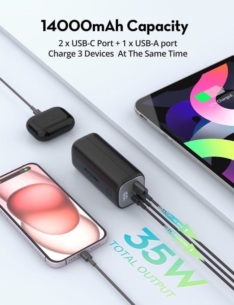 - بطارية متنقلة بسعة 14,000 ملي أمبير بقوة 30 واط عالية السعة تدعم الشحن السريع بفضل منفذي تايب سي ومنفذ USB، مما يتيح شحن أجهزة متعددة بكفاءة.