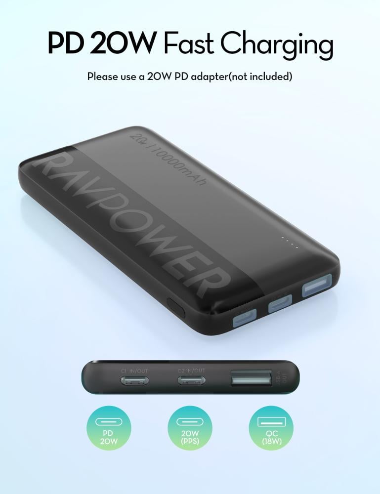 - تتميز بطارية متنقلة ravpower بسعتها الكبيرة 10,000 ملي امبير مما يوفر شحن كامل لا اكثر من هاتف دون الحاجة الى شحنها مرة اخرى.